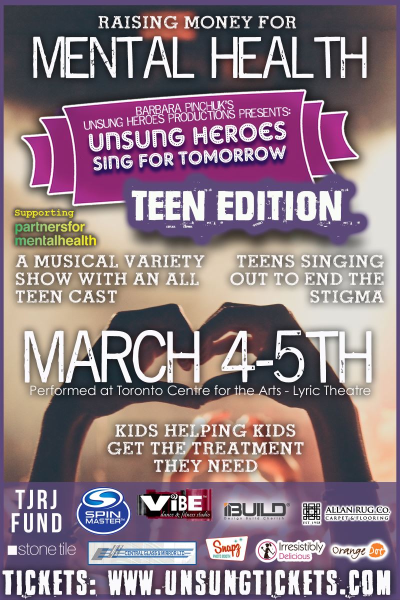 For two performances only, on March 4th and 5th, Unsung Heroes Productions presents: Unsung Heroes – Sing for Tomorrow Teen Edition! This is a musical revue show starring kids helping kids! Raising money to build awareness and improve access to care for youth mental health through Partners for Mental Health.